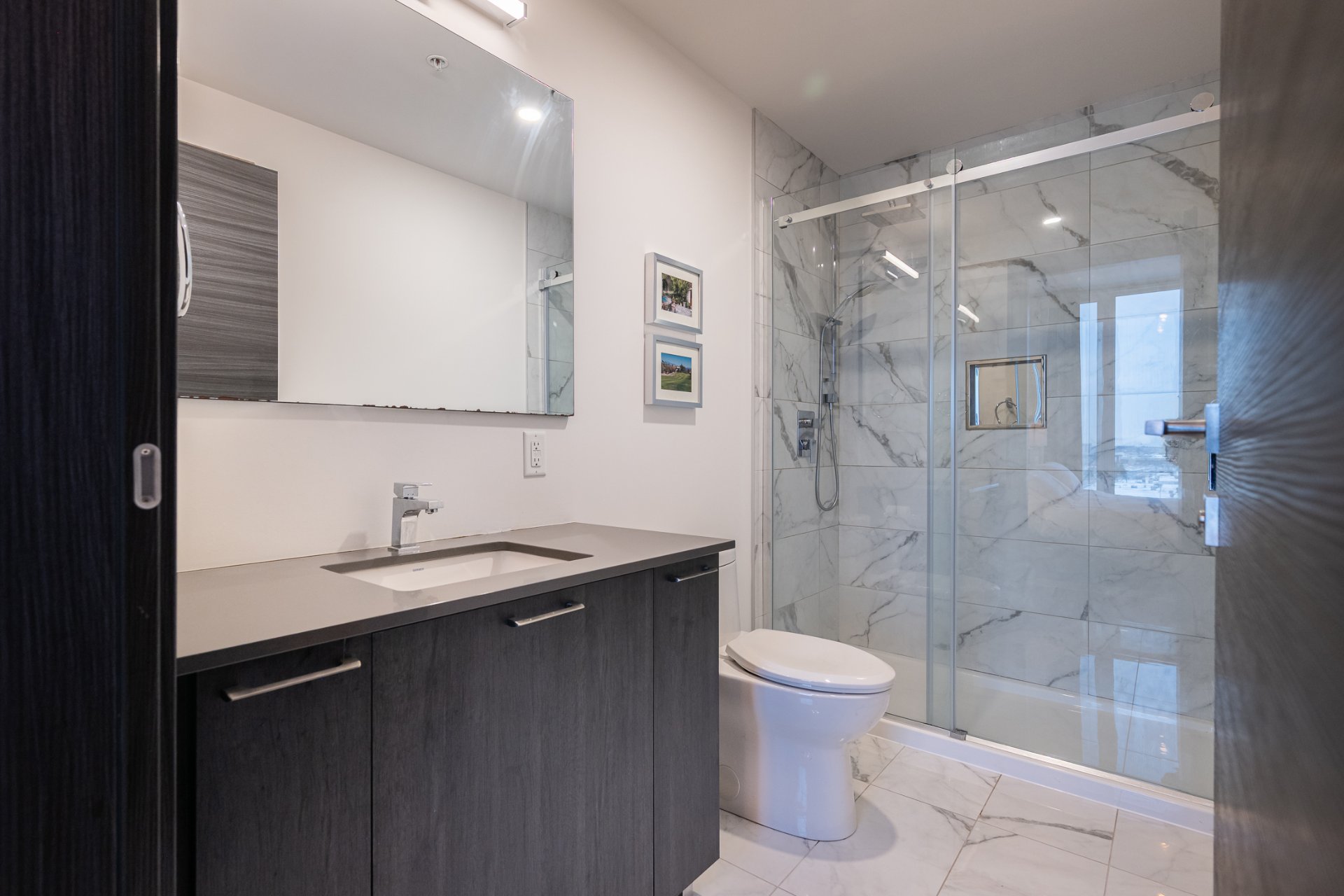 Appartement au 8e étage offrant deux chambres, deux salles de bain et une vue dégagée remarquable. L'unité comprend trois walk-ins (un par chambre et un pour les manteaux), un grand balcon en L, des électroménagers de qualité, des habillages de fenêtres sur mesure, un espace de rangement intérieur et un stationnement intérieur. L'immeuble propose une salle d'entraînement avec sauna, une grande salle commune, une piscine extérieure et une terrasse sur le toit.